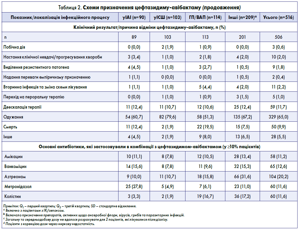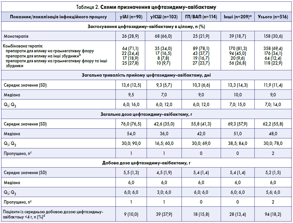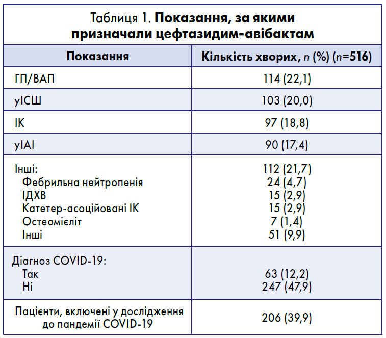 У 516 пацієнтів, які отримували цефтазидим-авібактам протягом щонайменше 72 годин, основними показаннями для його призначення були: ГП/ВАП (22,1%), уІСШ (20,0%), ІК (18,8%) та уІАІ (17,4%) (табл. 1). Близько 40% пацієнтів були включені у дослідження до початку пандемії COVID‑19; загалом 63 пацієнтам було встановлено діагноз COVID‑19 при госпіталізації або під час перебування в стаціонарі.