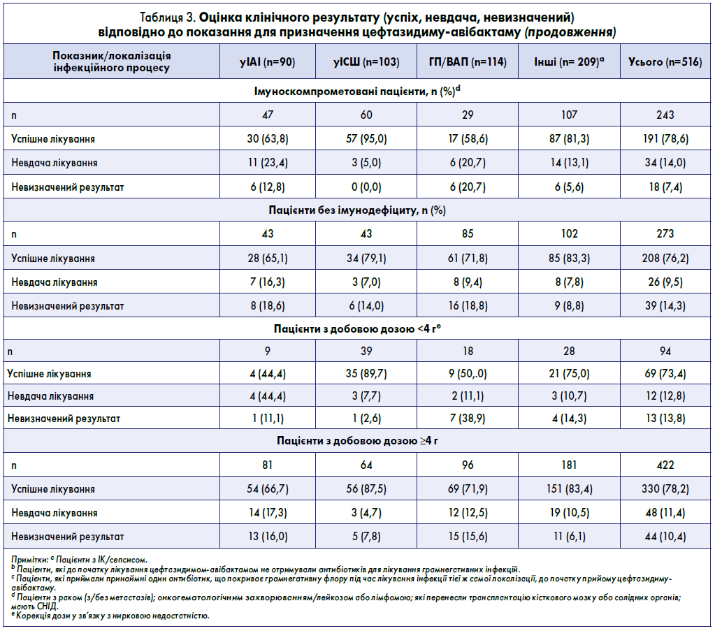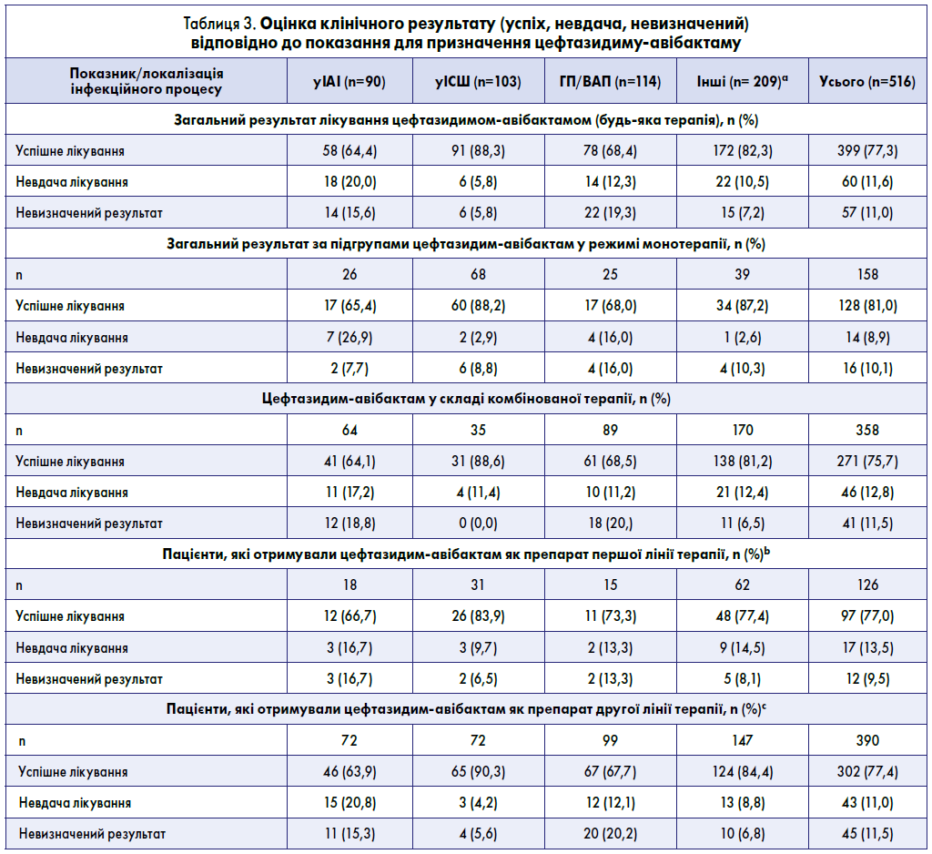 Клінічні результати (успішне лікування, невдача лікування або невизначений результат), оцінені під час госпіталізації, представлені у табл. 3.