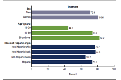 Малюнок 6: Специфічне та скориговане за віком лікування гіпертонії у дорослих за статтю, віком, національністю та іспанським походженн
